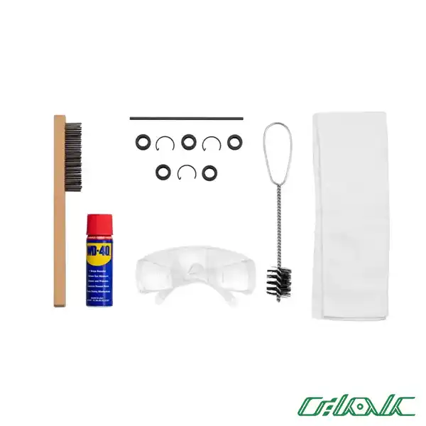 | اقلام همراه | فرچه سیمی گرد - عینک محافظ - فرچه سیمی - دستمال تنظیف - اسپری WD40- 5 عدد رینگ ضربه ای - 3 عدد خار - میله |